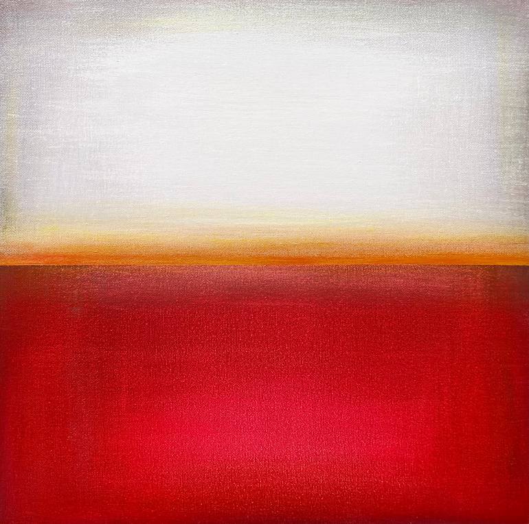 Acrylics on canvas allow the artist to build layers of color and texture, resulting in a simple yet refined composition. The interplay of red, yellow, creams, orange, gold and grays creates a captivating visual experience, reminiscent of Rothko’s regions of color, where the central line gains focus, meaning and purpose. The artist evokes a sense of light and depth, hinting at a spiritual dimension that enlivens the artwork.